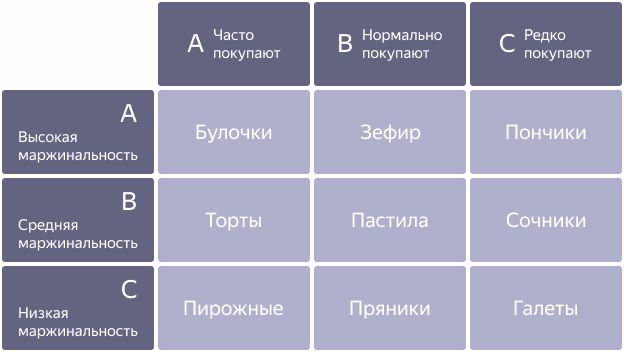 Из таблицы видно, что выгоднее снижать цены на продукты категорий АС и BC (например, пончики и сочники), так как они отличаются высокой маржинальностью и низким спросом. Один из вариантов стимулирования покупок — предлагать клиенту скидку на товары АС и BC при покупке продуктов категории АА.